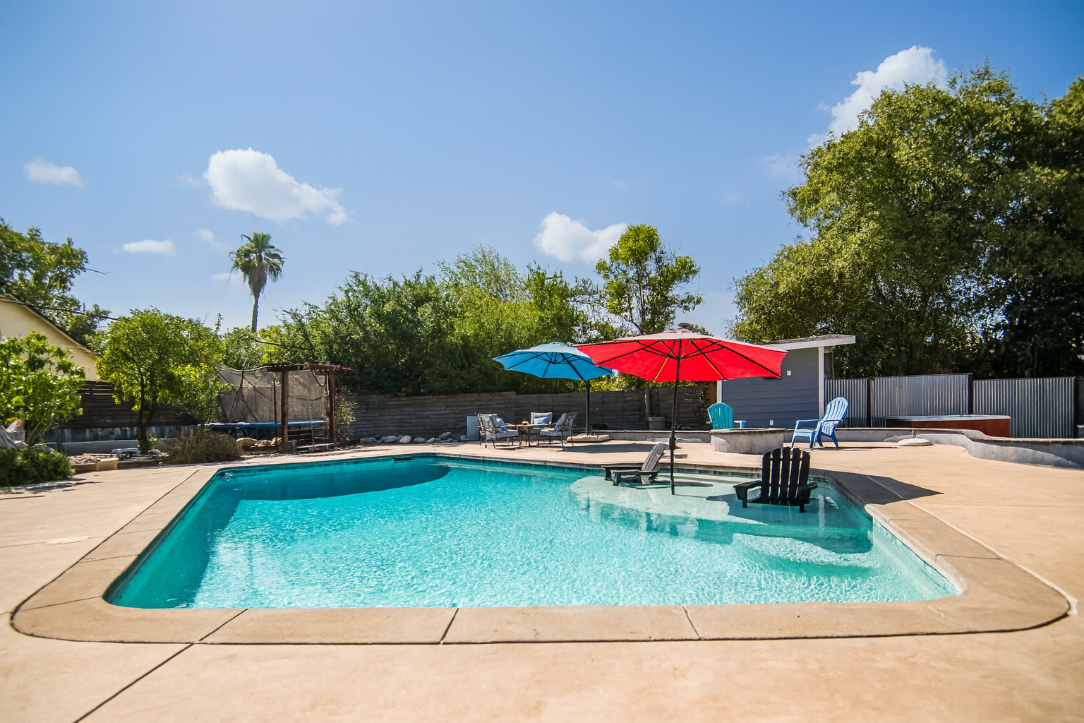 Resort-style backyard with sparkling pool, spa, and outdoor seating